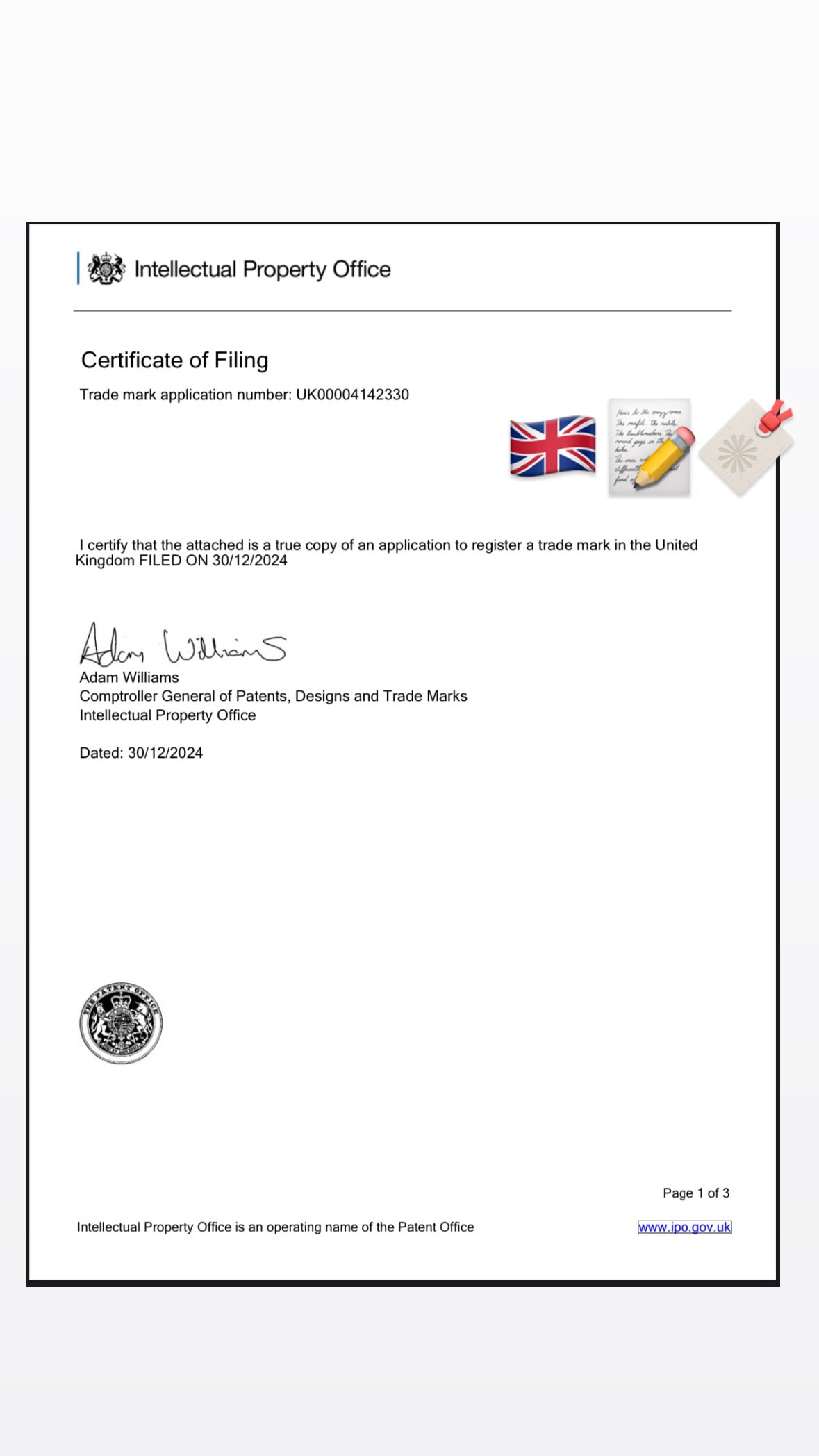 • UK Trademark Registration (UK00004142330) — verified with IPO format and issued by the Comptroller General .