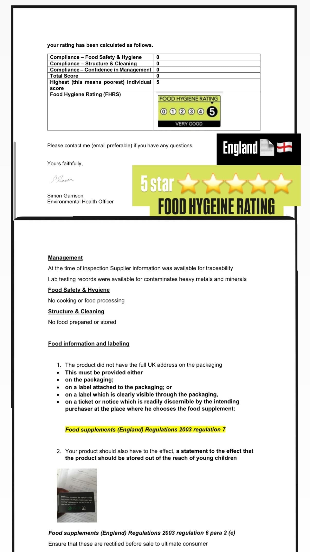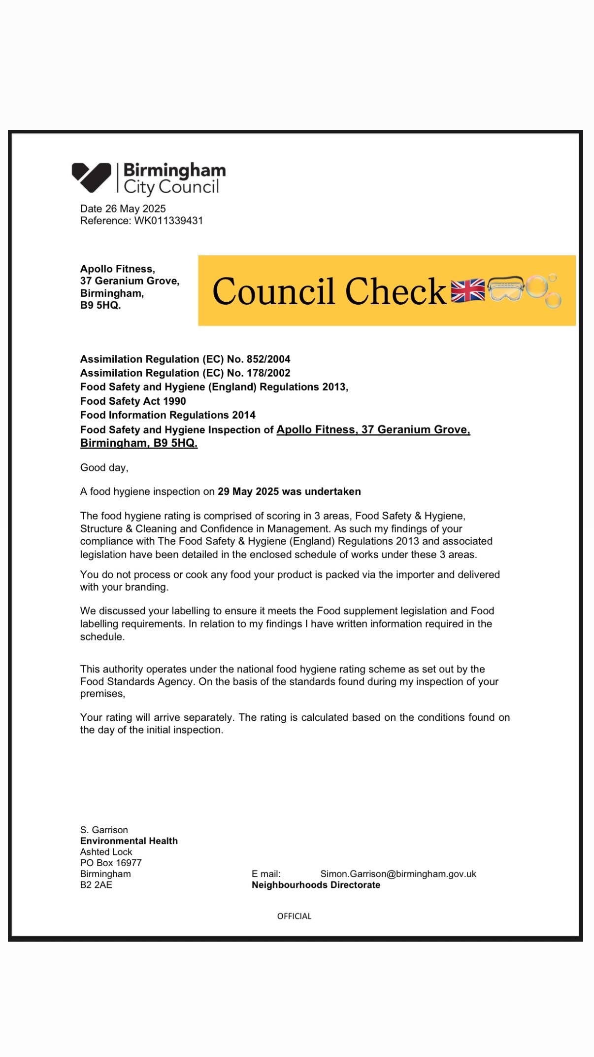 • UK Food Hygiene & Council Inspection (Birmingham) — signed by Environmental Health Officer Simon Garrison, referencing Food Supplement Regulations 2003.