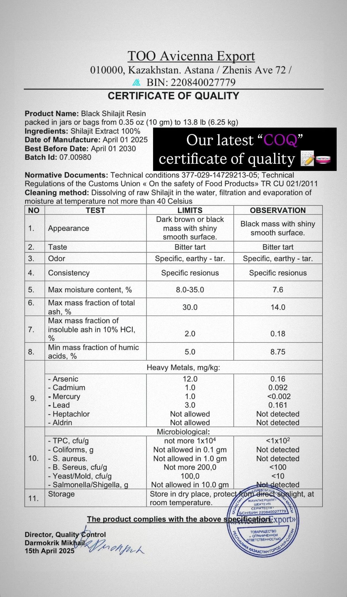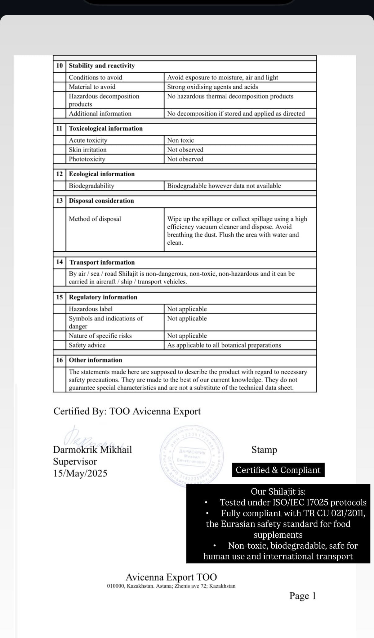 Our Shilajit is a premium 100% pure Shilajit resin sourced from the Altai region, manufactured and distributed in full compliance with international safety, purity, and ethical standards. Below is a breakdown of its certifications and the implications of each on product quality, safety, and consumer assurance.