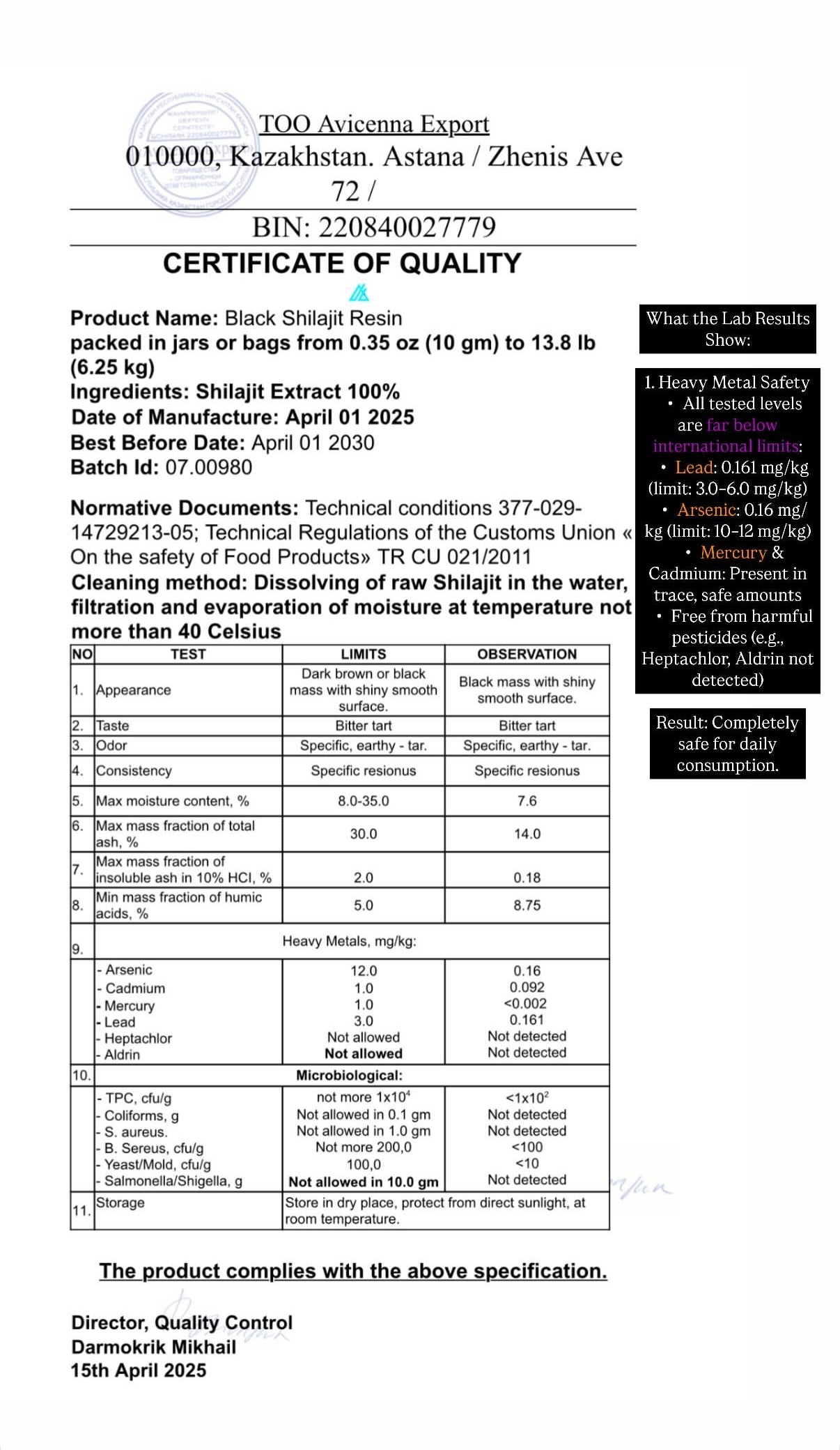 🧪 2. Kazakhstan – Avicenna Export COA & Quality Certificate (Apr 2025)