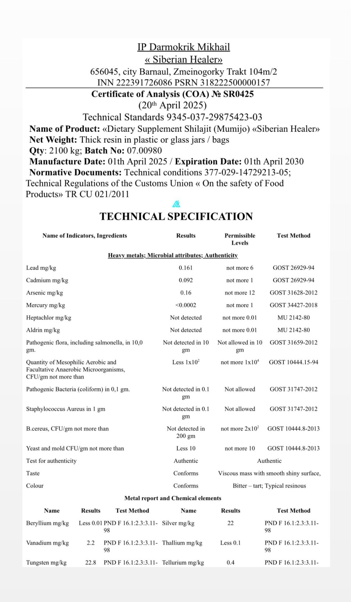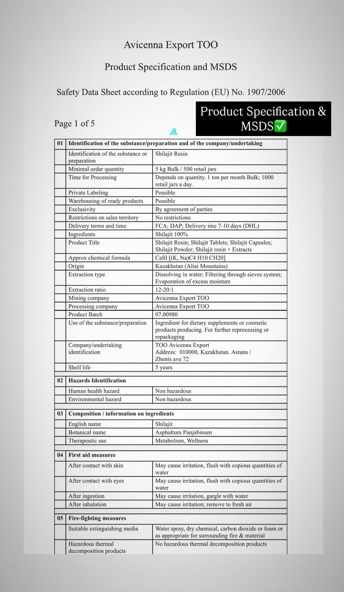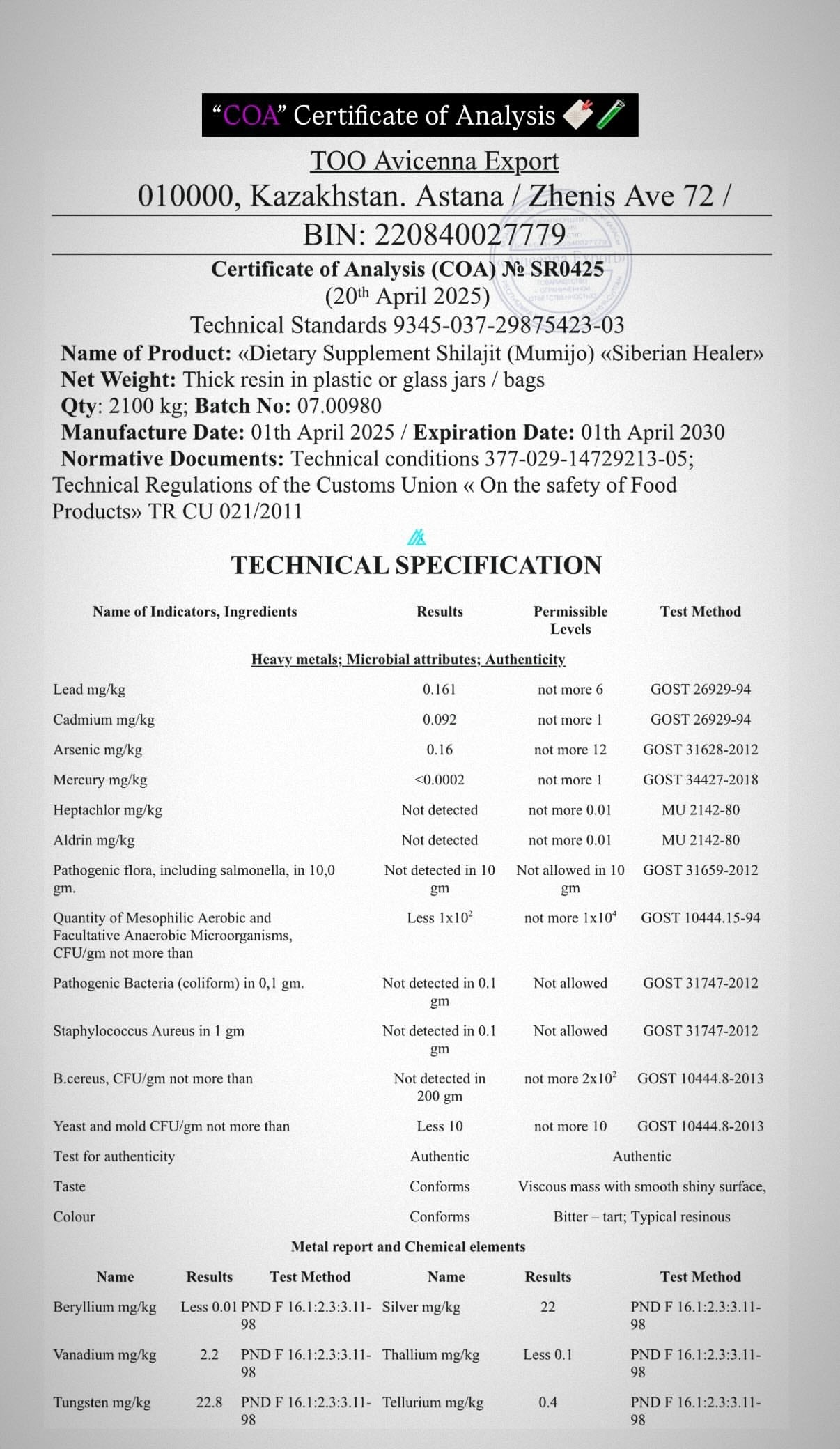 • Kazakh Avicenna Export COA, MSDS, and Technical Specs — batch 07.00980, detailing composition, microbial safety, heavy-metal analysis, amino acids, vitamins, minerals, radionuclide levels, and GOST test methods.